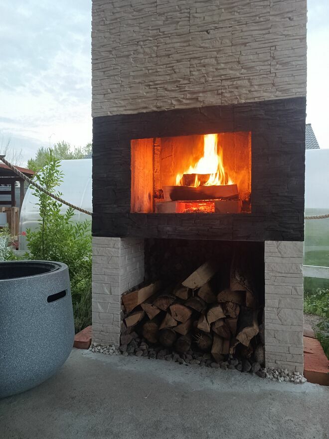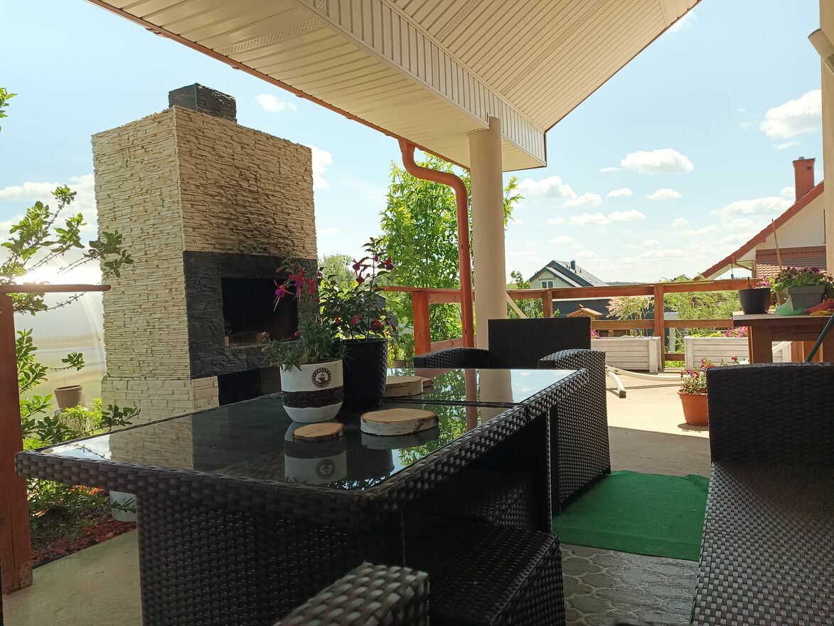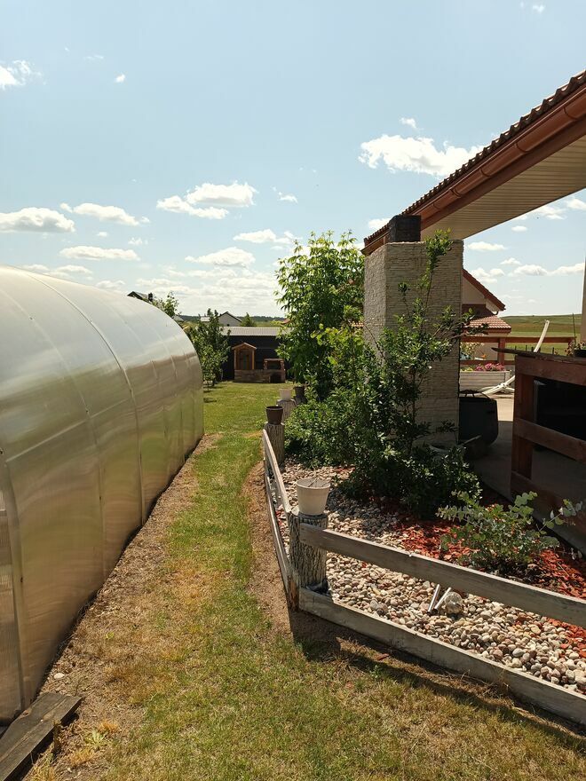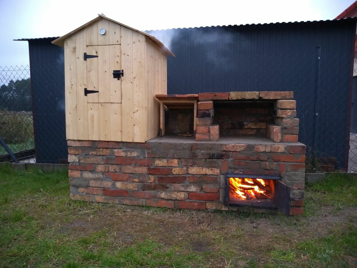 Na zewnątrz: kominek, wędzarnia, szklarnia, oczko wodne.